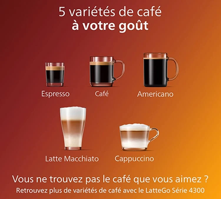 Savourez, avec cet expresso broyeur de la gamme Philips Lattego, 5 boissons parfaitement réussies, à la maison : expresso, lungo, americano, cappuccino, latte macchiato et eau chaude (idéal pour vos thés, infusions).